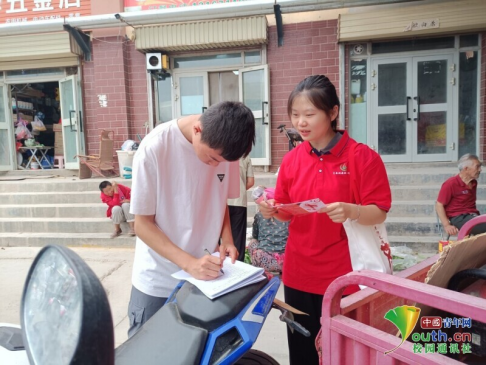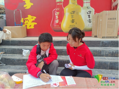 图为实践团成员发放宣传手册,并邀请青少年填写问卷