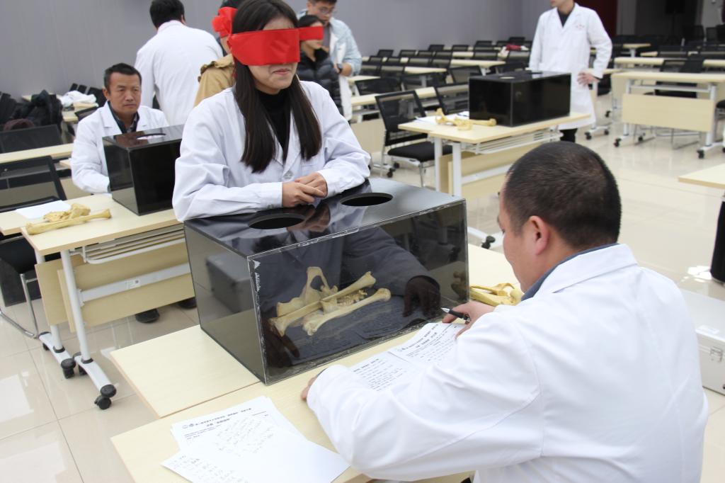 大赛内容分看图识骨、摸骨辨识、盲眼摸骨三个环节,从多方面考察同学们对骨学知识的掌握情况。
