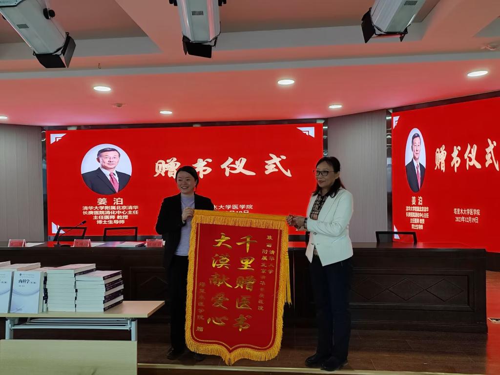 仪式最后,王琳琳经理代表yl7703永利向姜泊教授献锦旗,崔教授为教师们发放书籍。此次书籍捐赠不仅丰富了公司的书籍类型,更寄托了姜泊教授对祖国西部医学教育事业的深切关心。