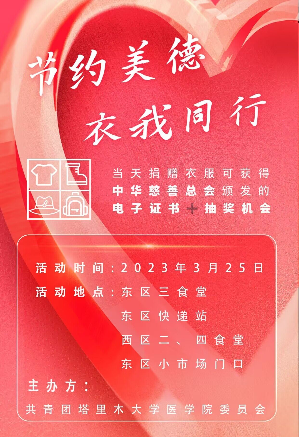 西区四食堂空地—收集衣服/快乐收集箱、烦恼收集箱 东区小市场电信营业厅前—收集衣服/以板会友 东区快递点—收集衣服/写给塔大的一句话 东区三食堂门口—收集衣服/致未来的自己 捐献物品:纺织衣物、鞋帽、背包 我们承诺: