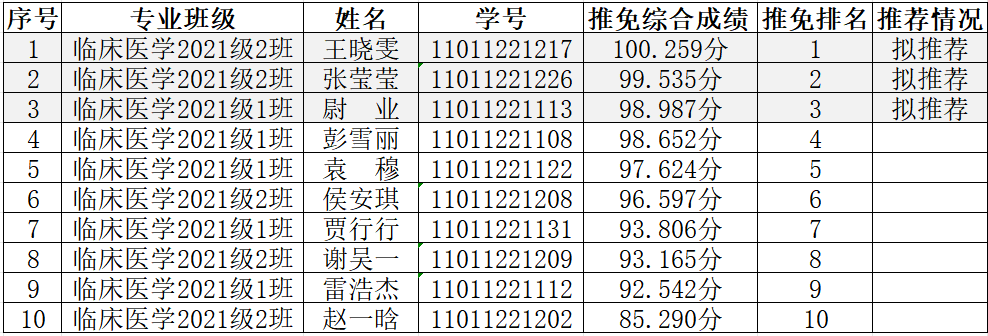 根据《yl7703永利集团官网关于做好2026年推荐优秀应届本科毕业生免试攻读研究生工作的通知》要求,按照《yl7703永利关于做好2026年推荐优秀应届本科毕业生免试攻读研究生工作的通知》(下简称《通知》)《yl7703永利2026年推荐免试研究生工作实施细则》时间安排,截止9月5日下午18时,yl7703永利推免研究生领导小组收到10位2026届临床医学专业优秀毕业生申报材料,经9月6日-7日召开的领导小组会议,对申报材料进行逐一审核,认真核算综合成绩,并经过员工确认成绩后,产生最终排名,提交公司党政联席会通过。现对2026年推免名单进行公示:
