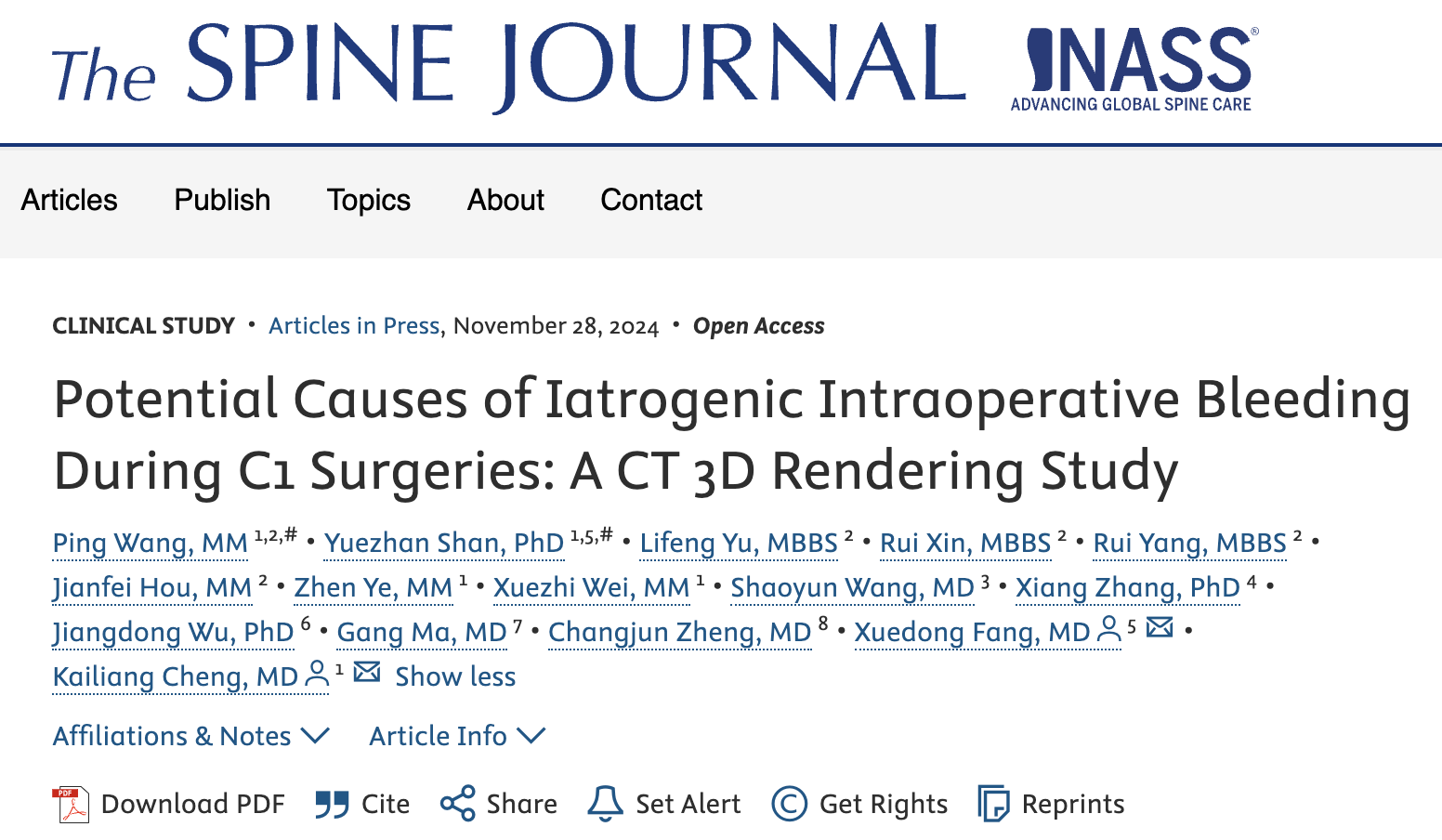 11月28日,在yl7703永利王平老师的指导下,yl7703永利临床医学2022级于立峰、辛瑞、杨瑞分别以第三、四、五作者发表了临床研究论文:“Potential Causes of Iatrogenic Intraoperative Bleeding During C1 Surgeries: A CT 3D Rendering Study”,该文刊登在脊柱领域世界排名第一的杂志Spine Journal(1区TOP)。