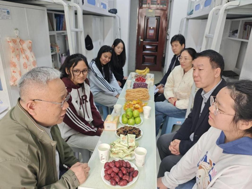 宿舍内洋溢着和谐氛围。谢建新详细了解同学们的学习进展、生活情况及家庭近况,叮嘱同学们注意劳逸结合和身心健康,希望大家珍惜青春时光,夯实专业基础,提升广博知识、开阔视野和发展眼光,相互帮助、团结友爱,在感恩奋进的校园氛围中共同成长成才。